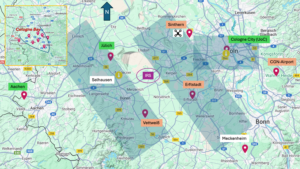 VITAL II observational setup concentrated in the Cologne Bay (CB, see inset figure, upper left). Red markers indicate VITAL II ground-based remote sensing profiling sites for wind, turbulence, temperature and humidity. All profiling sites are equipped with near-surface meteorology measurements (including radiation). Profiling sites with green background are existing, with a peach background are planned for VITAL II. ~100 Radiosondes will be launched on demand in the CB area. UAS Multicopter profiling sites are planned in Sinthern during the IOP between July and August 2026. Additional ~50 near-surface measurements of temperature, pressure and humidity will be available from the autonomous cold pool logger 2 (APOLLO 2.0) network to be set up in the gray-shaded areas. The purple oval indicates an MTG-S1 IRS pixel size. IRS coverage is available over the whole domain. Source of the map: Google Maps